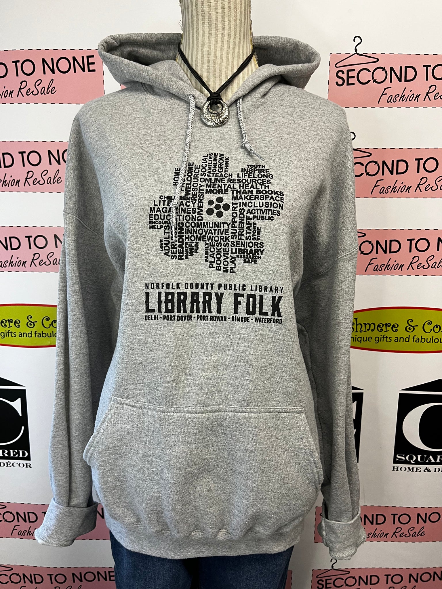 Wrap yourself in cozy comfort with this light grey "Library Folk" hoodie by The Folk. Crafted from a soft cotton blend, it features a charming Library Folk design that celebrates Norfolk County's literary spirit. The plush interior makes it perfect for curling up with your favorite book or enjoying casual days out. A playful essential for anyone who loves their reading nook as much as they love style.