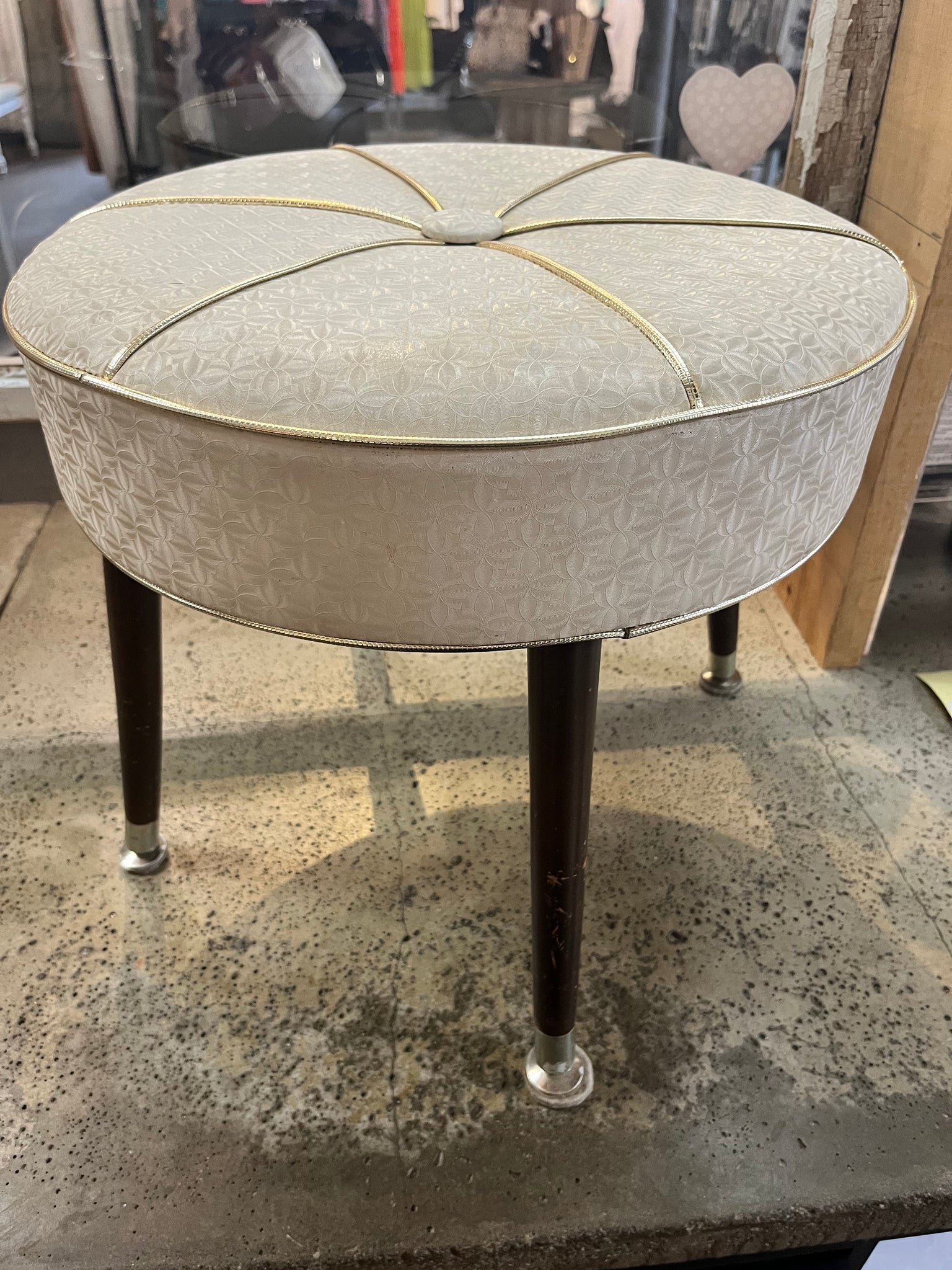 Add a touch of retro charm with this Vintage Footstool! Featuring a cool textured vinyl seat accented by gold trim and a button center, it’s a stylish nod to classic design. Supported by sturdy vintage wooden legs, it’s perfect for resting your feet, showcasing a plant, or adding quirky decor flair. In very good condition, this footstool brings both function and fun to any space. Measures 16"across x 14" tall.
