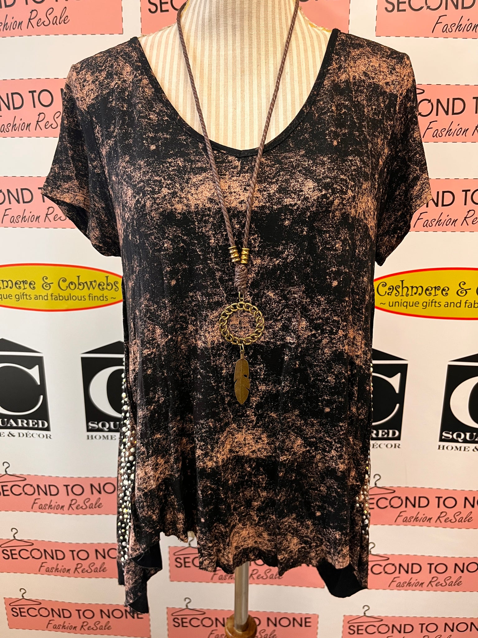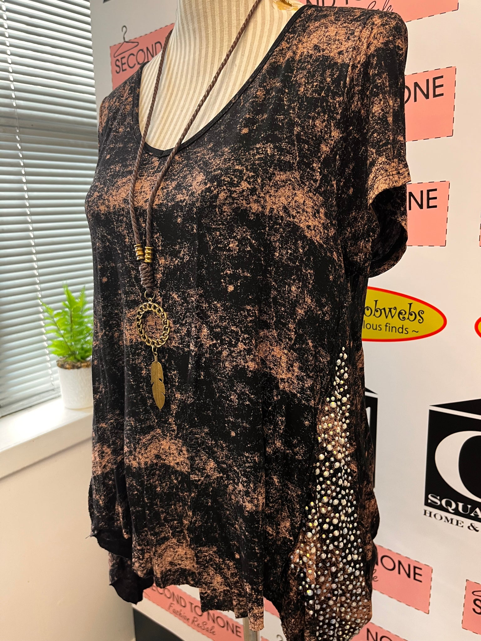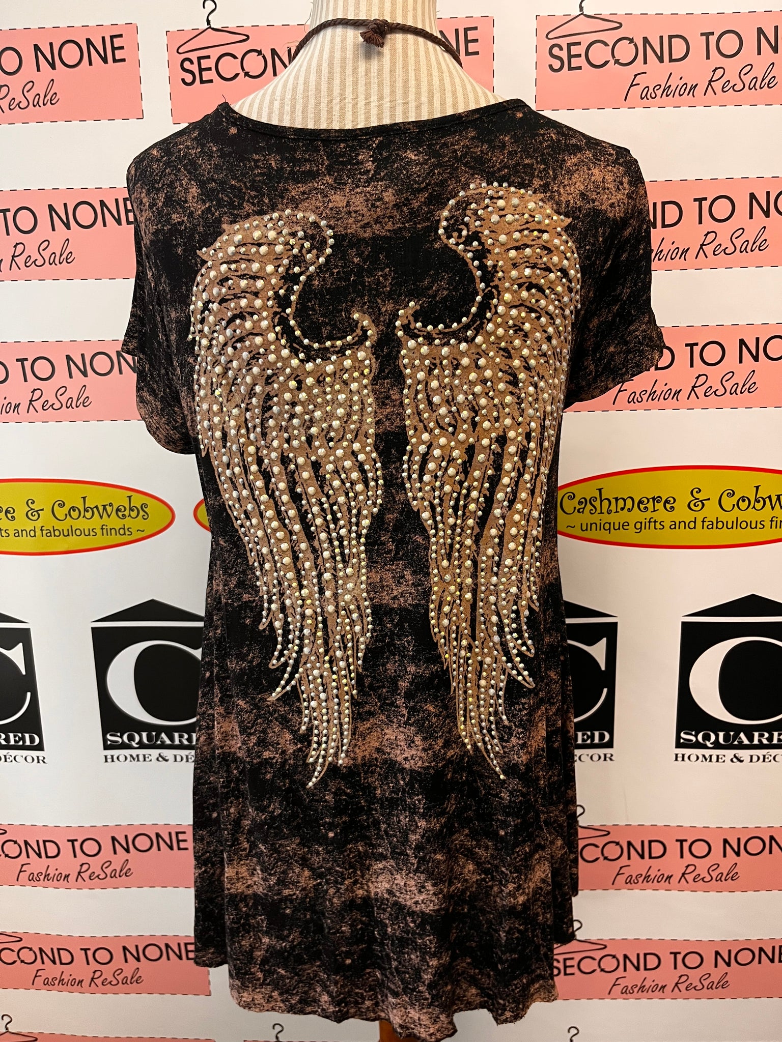 Edgy meets ethereal in this statement tee featuring a striking bleach-dyed black and pink colorway. The high-low front hem creates an effortless silhouette, while bold studded bling adorns the side panels for extra attitude. The real showstopper? A massive blinged-out angel wing design sprawling across the back with an extended hemline that commands attention. Perfect for those who blend gothic edge with celestial vibes.