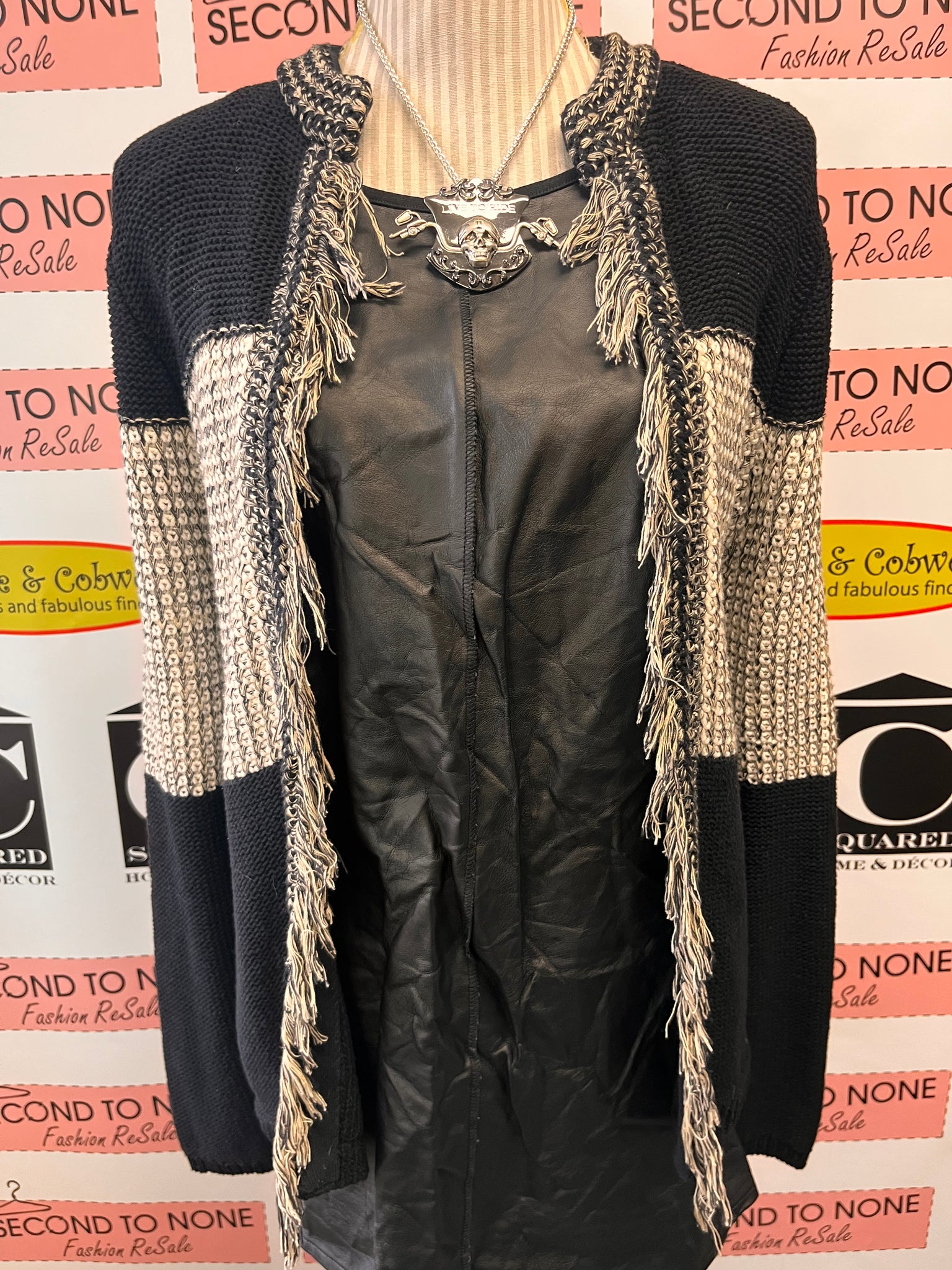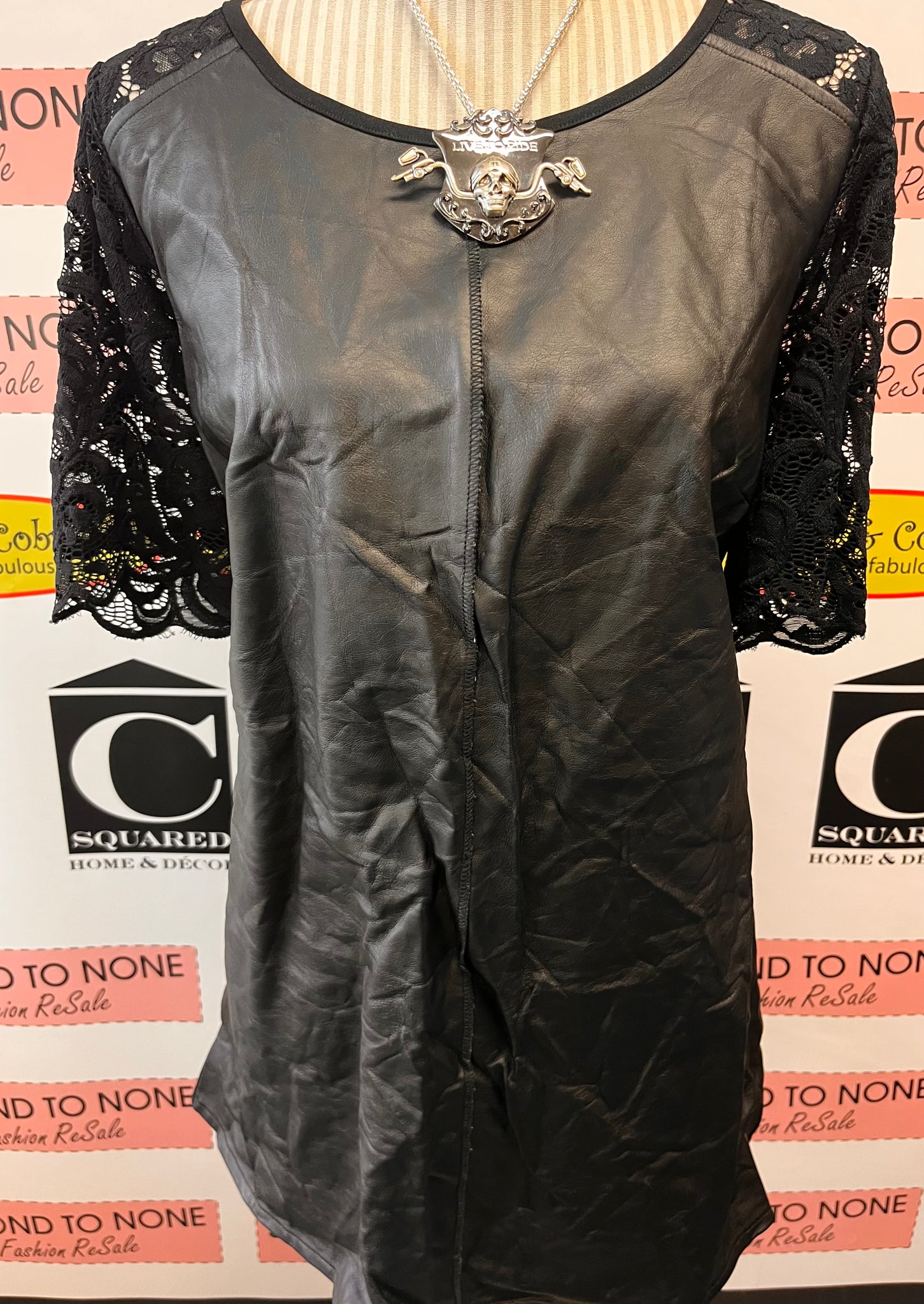 Make a statement with this striking NWT Cleo tunic, featuring delicate black lace short sleeves paired with a sleek faux leather body. The innovative zippered half-back accent adds an edgy, modern touch, while the smooth solid back ensures all-day comfort. Perfect for layering or wearing solo, this size L piece seamlessly transitions from casual to sophisticated styling.