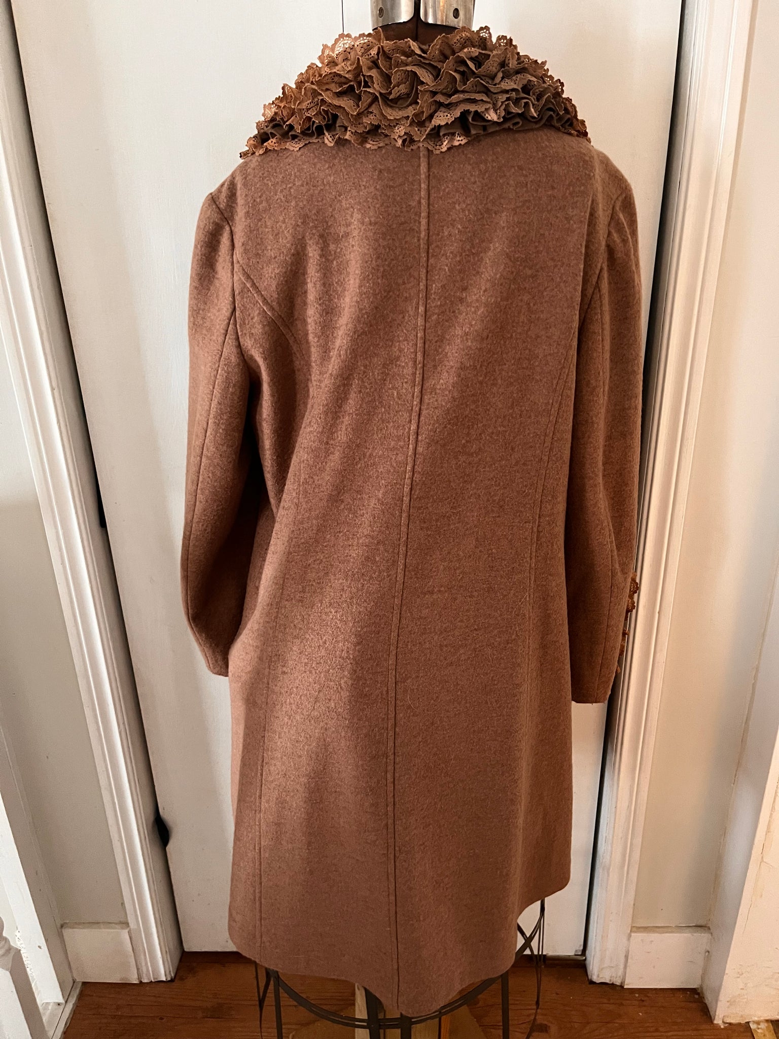 Slip into understated luxury with this Gilani wool-blend coat—a barely-worn gem that transitions effortlessly from boardroom to brunch. Warm camel tones pair beautifully with exquisite ruffled lace trim at the neckline and cuffs, while a fully-lined interior ensures comfort and structure. The hook-and-eye front closure and slash pockets add vintage charm and practicality. Layer it over dresses, trousers, or wear solo as a lightweight coat. Elegant, stunning, and ready to become your go-to piece. 60% polyester/40% wool.