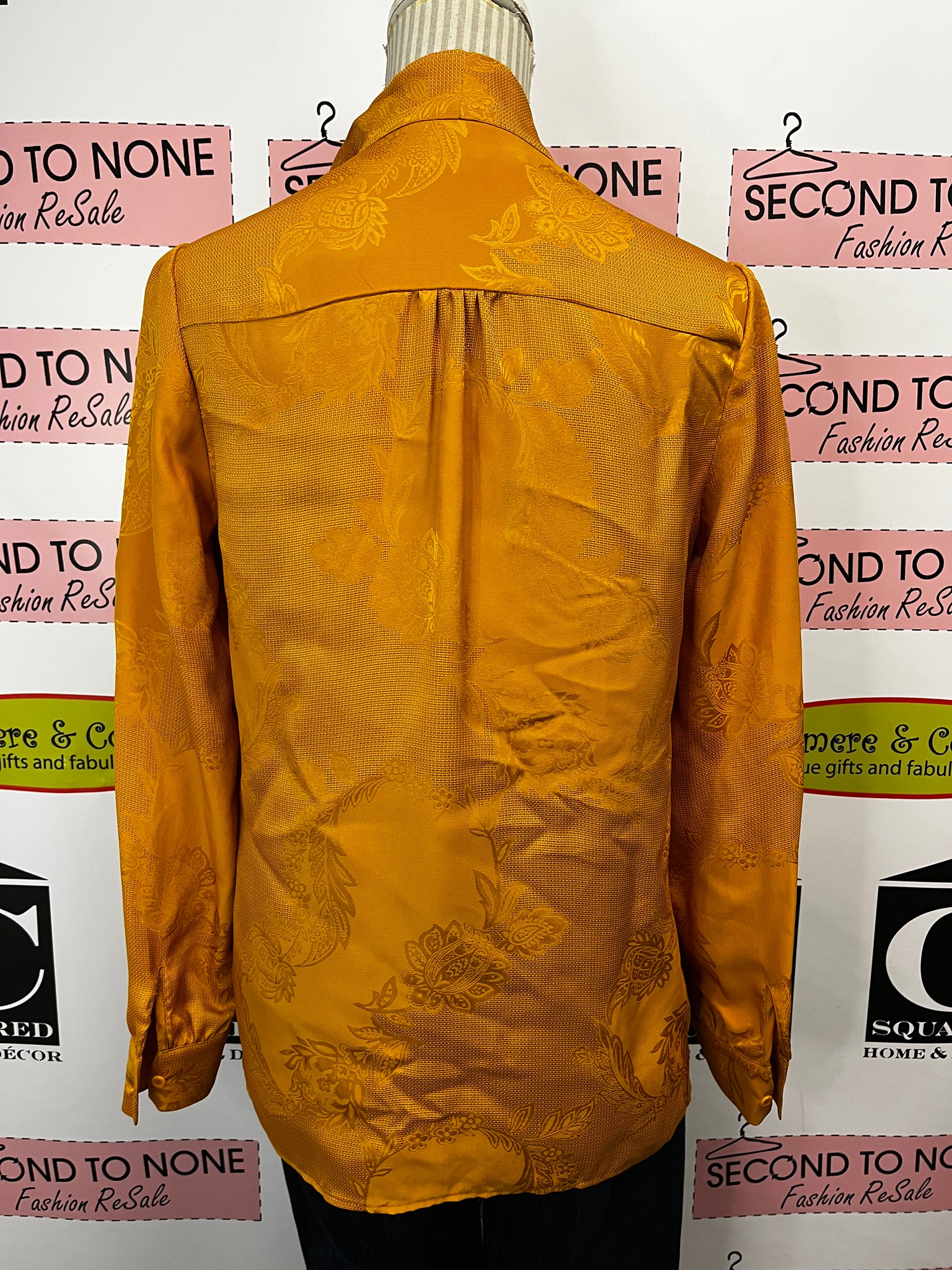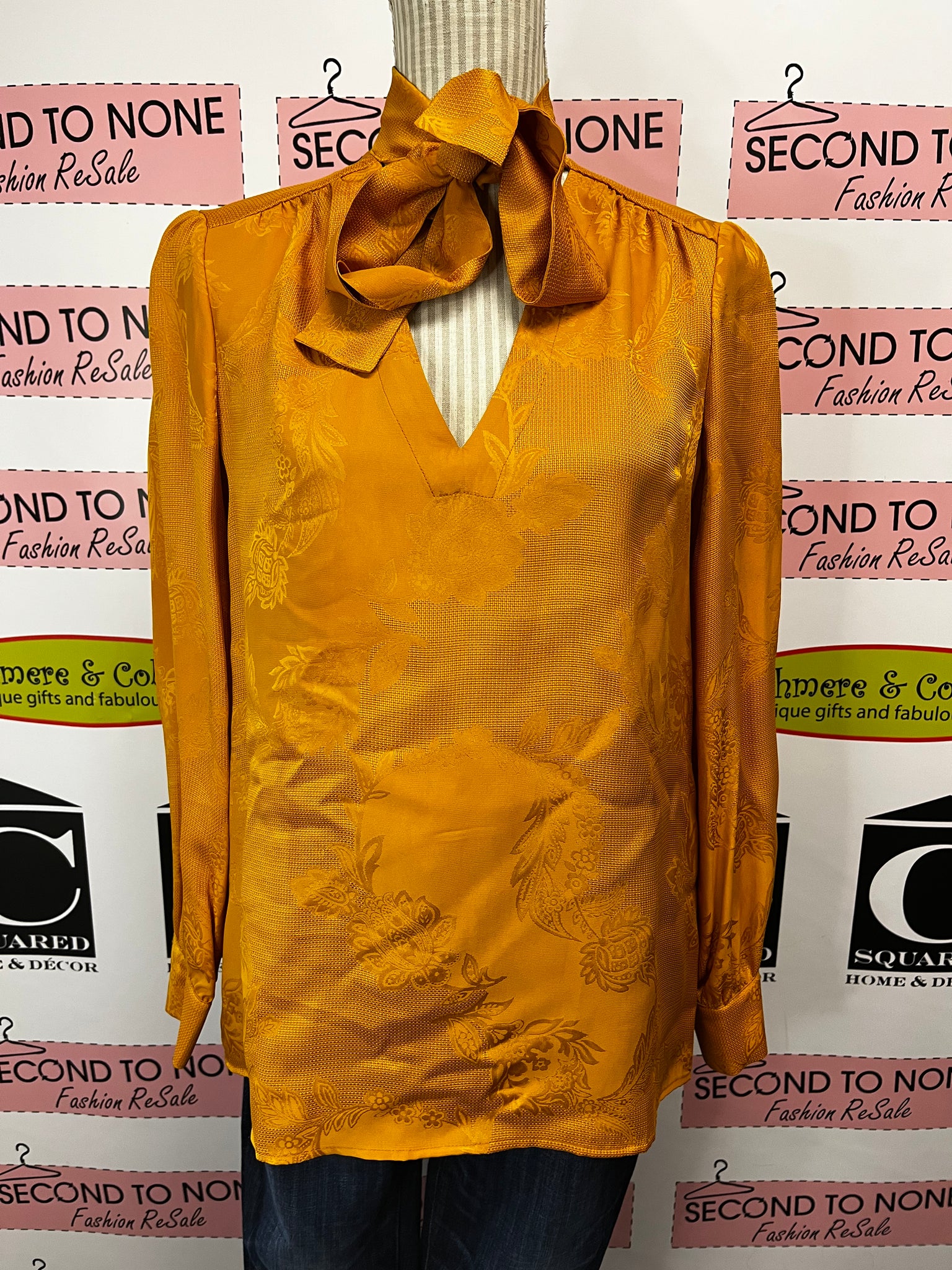 Elevate your wardrobe with this stunning mustard yellow blouse by Judith & Charles—a fresh find still sporting its original tags. Crafted from a luxurious silk-look cotton blend, it drapes beautifully while keeping things comfortable for all-day wear. The charming tie neckline adds a flirty touch, while long sleeves offer versatile styling options. Perfect for dressing up a casual outfit or bringing warmth to your professional look. A timeless piece that's ready to become your new favorite.